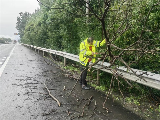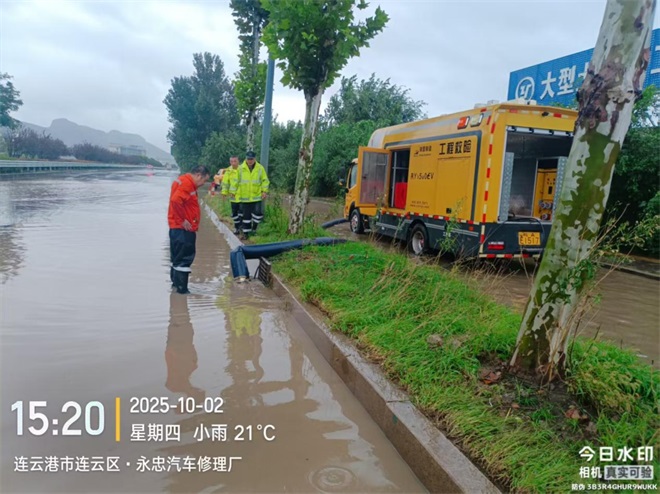 10月2日,大雨突降,公司迅速启动防汛应急预案,严格落实防汛措施,不分昼夜,连续对所辖高速公路、国省干线等重点路段及沿线设施开展隐患排查,确保道路安全畅通。针对G310港城大道、G228新光路等路段积水较多、路边树木倒伏等严重情况,公司立即组织橙色突击队员、道路养护人员及时清理疏通倒伏树木、排水沟、雨水井,全力保障排水系统畅通与道路安全,累计出动道路养护人员 90人次、巡查车辆 12台次,调配各类机械设备 14 台次,清理倒伏树木20余株。连云港综合客运枢纽出站口突发雨水倒灌,公司立即组织应急人员协助连云港站前广场管理服务联盟调动水泵排水并引导旅客安全出行。经50分钟紧急处置,积水全部排除,道路恢复畅通。